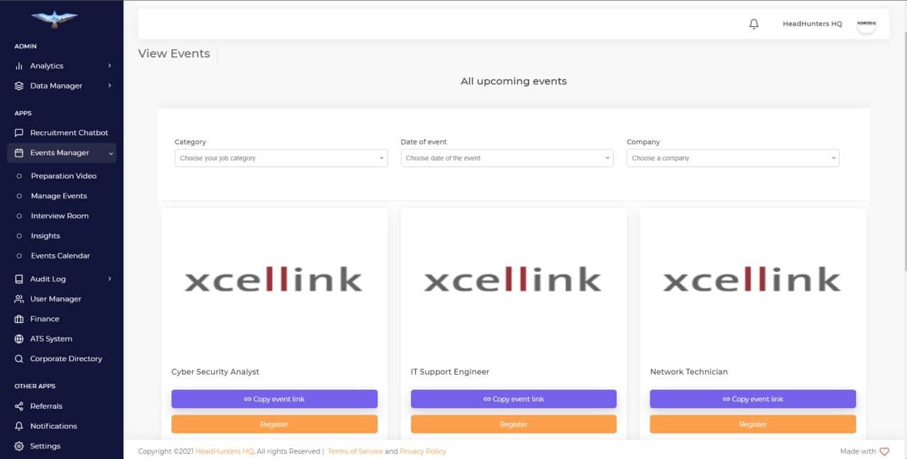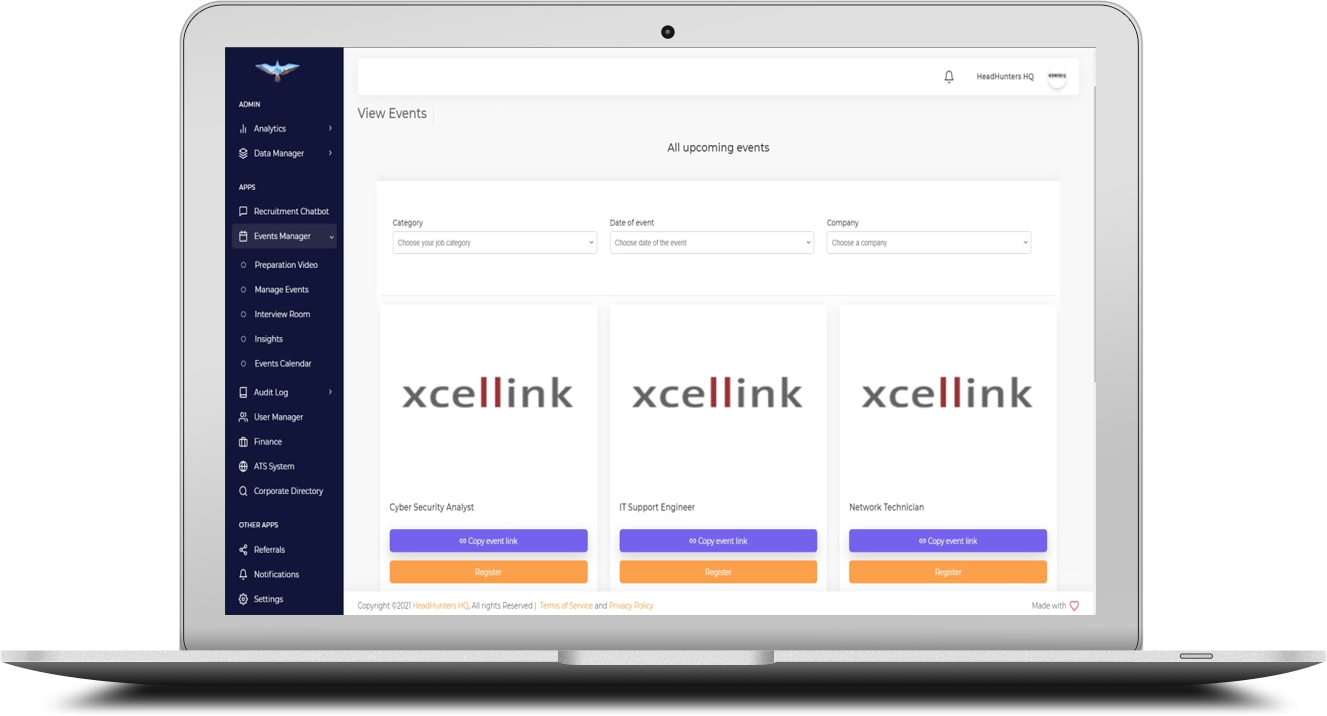 All the tools you need to organise a Career Fair successfully. For example, Attendance System, Queue System, Virtual Interview Room and more.